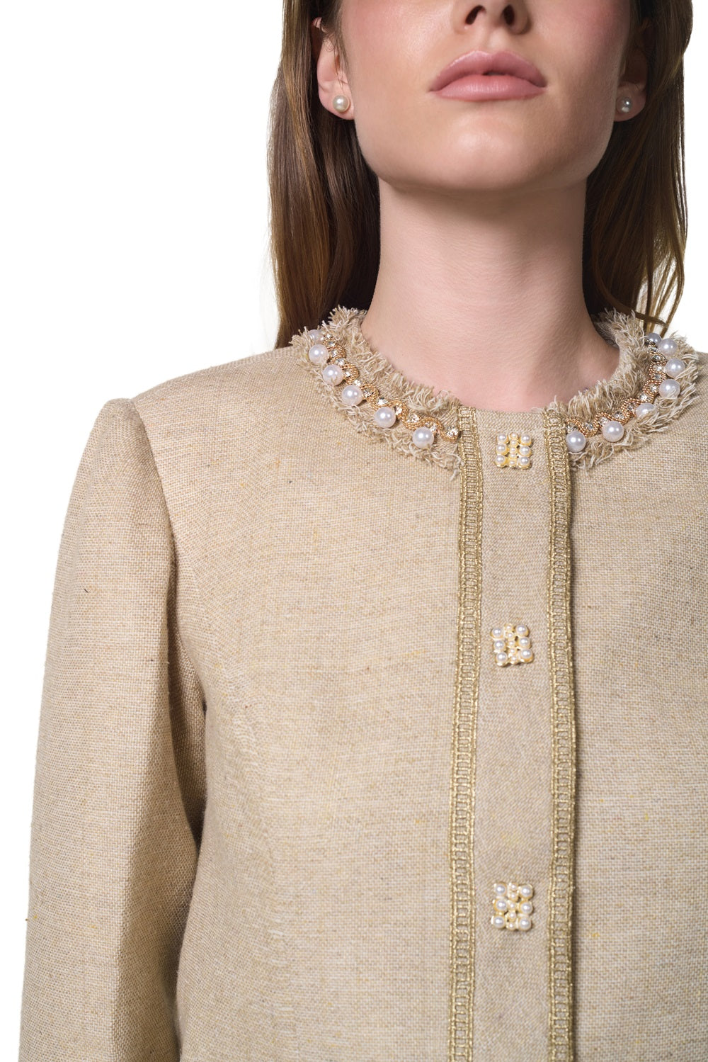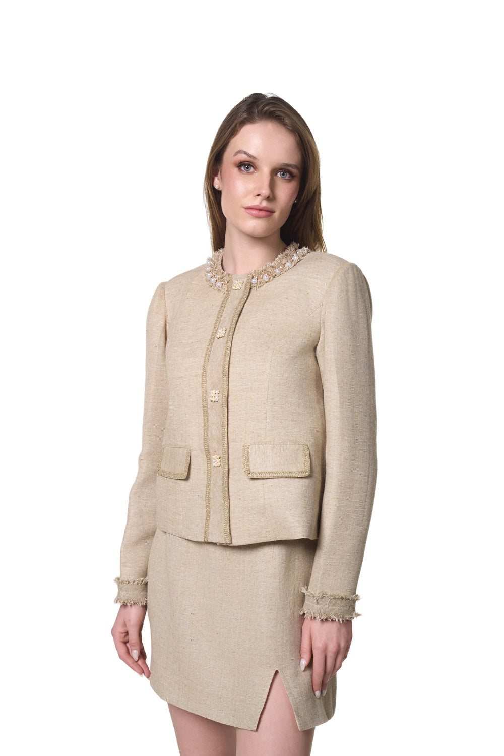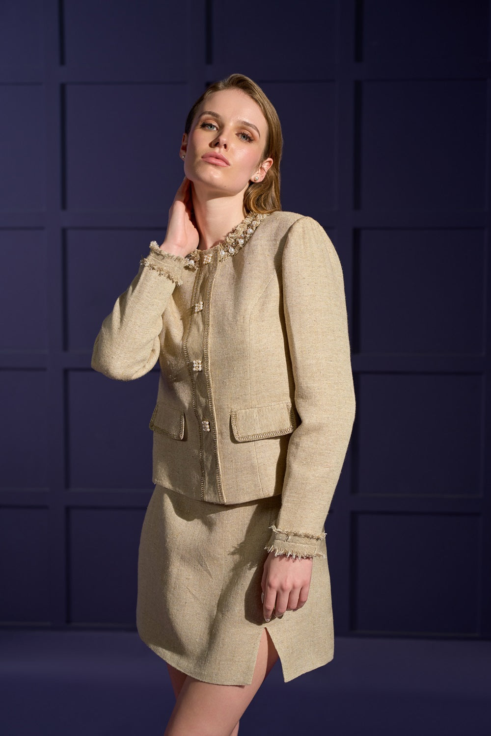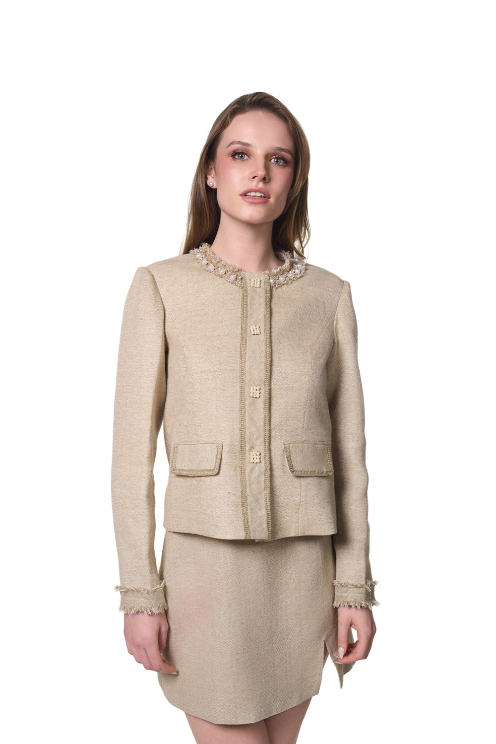 The georgia blazer is an elegant must-have designed with a classic fit. It’s beautiful gold and pearl detailing makes it perfect for a formal meeting or event. Pair it with Georgia trouser, skirt or shorts to complete the look.