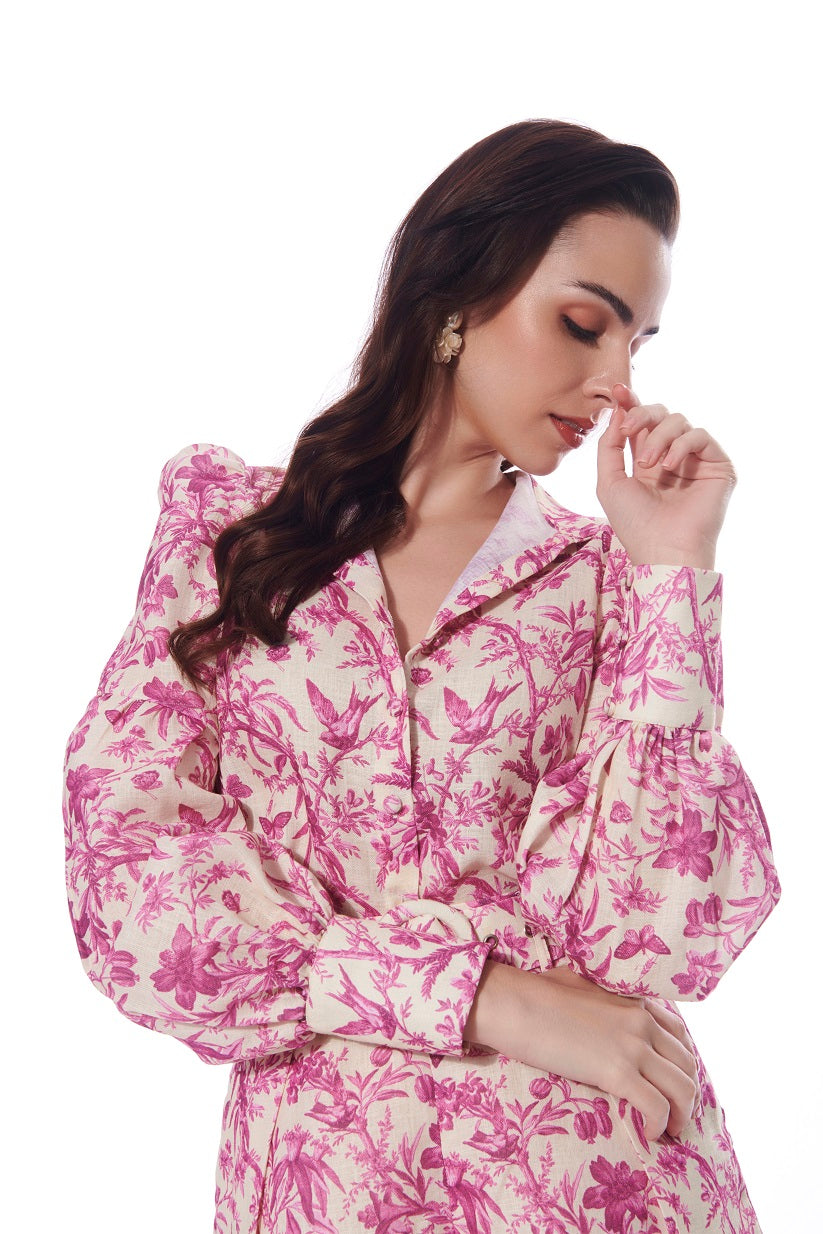This contemporary shirt is made in our classic toile print which features a stand collar with blouson sleeves. Its elongated cuffs add to the detailing.