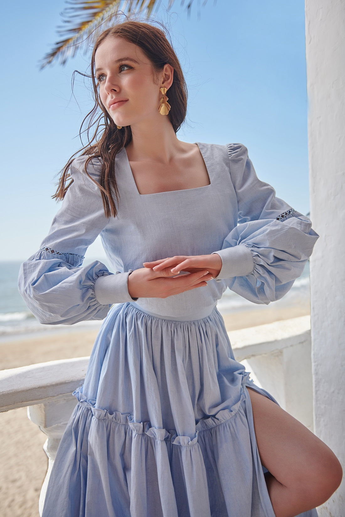 The Kate Top presents a relaxed fluid fit with a high square neckline, lace detailing and cuffed blouson sleeves. This versatile style can be styled up or down to suit the occasion.